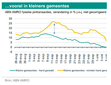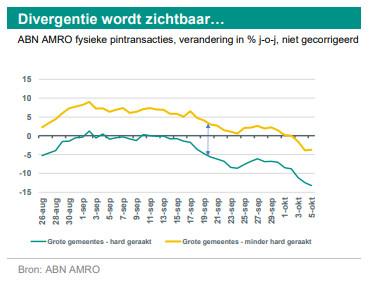Op 28 september kondigde het kabinet strengere maatregelen aan. In de weken daarvoor liepen veel bestedingscategorieën al terug, zoals de entertainment en wellness branche. De sterkste dalingen deden zich voor bij de subcategorieën openbaar vervoer, bioscopen en musea. Wat ook opvallend is: voor de reisbranche en het vervoer zijn geen verdere maatregelen aangekondigd, maar ook deze categorieën zien een grote terugloop aan bestedingen in de week van 28 september (-45% j-o-j en -15% j-o-j). Wij benoemde al eerder dat overheidsingrijpen het angsteffect kan versterken: mensen zien misschien na de aankondiging van 28 september de ernst van de situatie in. Het kabinet kondigde ook aan dat eet- en drinkgelegenheden tot 21.00 inloop mogen hebben en om 22.00 uur de zaak moeten sluiten. We zien dat sinds de aankondiging de bestedingen in de horeca weer flink teruglopen (-5,3% j-o-j), de grootste terugval sinds de week van 8 juni. Een combinatie van het de opleving van het virus en de strengere maatregelen zijn dan ook direct terug te zien in de bestedingen.