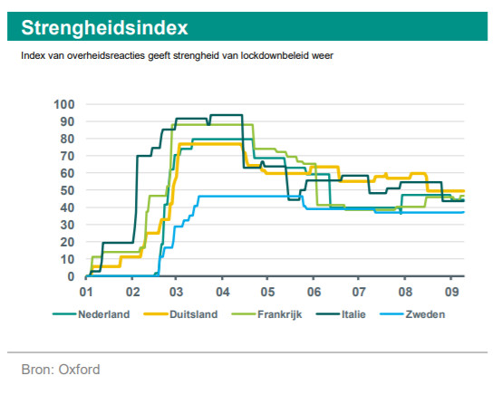 *Deze index van overheidsreacties geeft per land de ontwikkeling van de strengheid van het lockdownbeleid weer. Zie: https://www.bsg.ox.ac.uk/research/research-projects/coronavirus-government-response-tracker