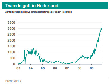 In de onderstaande grafiek is duidelijk te zien dat Nederland zich sinds medio september in een tweede covid-19-golf bevindt. Het aantal nieuwe besmettingen ligt op het moment van schrijven boven de 3000 per dag. Hoewel er nog weinig gegevens beschikbaar zijn – de tweede golf is pas twee weken oud – signaleren we al wel een klein voorlopig economisch effect. Het totaal aantal transacties (gecorrigeerd voor seizoensinvloeden en vakantie) daalde in de laatste twee weken van september met 8% j-o-j, terwijl de gemiddelde daling over juli en augustus 4% j-o-j bedroeg. De fysieke (offline) bestedingen waren voor het eerst sinds juni negatief. Transacties met betaalpas waren in juli en augustus nog 1,5% j-o-j hoger, maar medio september waren ze 2% j-o-j lager. Om dit in perspectief te zetten: in de derde week van maart – de eerste week van de lockdownperiode – daalden fysieke transacties met 21%. Opmerkelijk is verder dat onlinetransacties in de laatste twee weken sterk terugliepen (-14% j-o-j)*, terwijl deze in maart en april fors toenamen (+9% j-o-j). Dit doet vermoeden dat angst of een bewuste keuze om minder naar buiten te gaan niet de enige factor is, maar dat er sprake is van een algemene trend om minder uit te geven.**