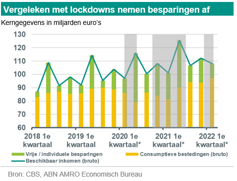 De vrije/individuele besparingen in kwartalen voor, tijdens en na de lockdowns (gemarkeerd in de figuur) zijn in elk tweede kwartaal groter dan in de andere kwartalen – het zogenaamde seizoenseffect door vakantiegeld. Als we deze buiten beschouwing laten, zien we dat het aandeel van het besteedbaar inkomen dat naar vrije/individuele besparingen gaat sterk toeneemt tijdens de lockdowns. Dit representeert de coronabesparingen die gedaan zijn. Uit de afgelopen dinsdag cijfers blijkt dus dat er minder extra gespaard is het eerste kwartaal van 2022.