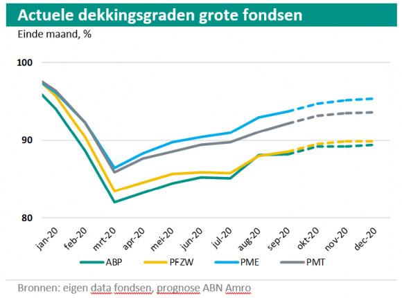 Dinsdag bleek uit DNB-cijfers dat pensioenfondsen er weliswaar op vooruit gaan, maar dat kortingen nog niet van de baan zijn. We verwachten dat in 2021 bij meer gepensioneerden dan ooit de pensioenuitkeringen verlaagd gaan worden: zo’n 1,4 miljoen mensen. Daartoe zijn pensioenfondsen verplicht zodra de actuele dekkingsgraad op 31 december aanstaande onder de kortingsgrens van 90% zit. De tweede grootste pensioenfonds, ABP en PFZW zullen deze grens naar alle waarschijnlijkheid niet halen, maar ook een aantal middelgrote fondsen zitten zullen moeten gaan korten.