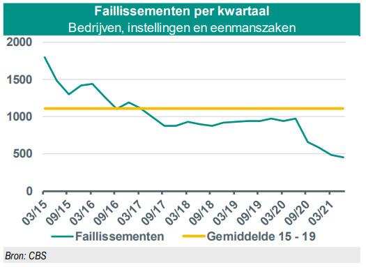 Het aantal faillissementen dat in Nederland per kwartaal uitgesproken wordt blijft maar dalen. Waar we in het eerste kwartaal nog dachten dat de bodem in zicht was, viel het aantal faillissementen in het tweede kwartaal weer 7% lager uit. Je hoeft geen gepromoveerd econoom te zijn om de oorzaak te duiden: de coronasteun, die recent verlengd werd tot het einde van het derde kwartaal. Ook vooruitkijkend zal het aantal faillissementen dus nog laag zijn.