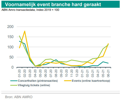 De nieuwe aangescherpte maatregelen zijn met name een enorme tegenvaller voor de evenementenbranche. Deze sector heeft – in tegenstelling tot de meeste andere sectoren – nauwelijks kunnen terugveren in de zomer van 2020 omdat er destijds nog restricties van kracht waren. In aanloop naar de zomer en de volledige heropening steeg de online verkoop van evenementen weer sterk, van een niveau van bijna 0 naar 20% boven het gemiddelde niveau van 2019. Dit herstel zal zich nu waarschijnlijk weer ongedaan maken. Vooral nachtclubs en festivals kunnen niet opereren onder de huidige restricties.