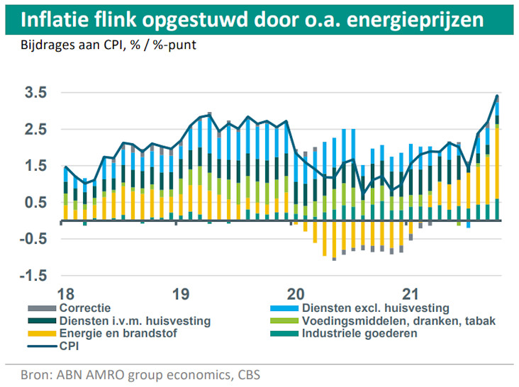 De energieprijzen liepen aan het begin van 2021 sterk op. Dit betekent dat de prijzen begin 2022 fors hoger liggen dan begin 2021. Zodoende blijft de bijdrage van de energieprijzen aan de inflatie de eerste maanden van 2022 in ieder geval hoog. Als we verder in het jaar kijken dan zal pas in september 2022 in ons scenario de bijdrage weer onder het historisch gemiddelde van een half procentpunt komen. Als de energieprijzen op het huidige niveau blijven, zal de inflatie dus naast de eerste maanden ook de latere maanden van 2022 sterk beïnvloeden. Een onwaarschijnlijk scenario als de laatste verwachtingen voor energiemarkten meegenomen worden maar nuttig om te weten dat de prijsschommelingen op energiemarkten langere tijd effect uitoefenen op de Nederlandse inflatie. (Jan-Paul van de Kerke)