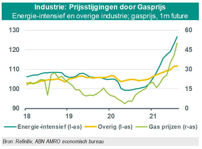 De figuur hierboven geeft de ontwikkeling van de afzetprijzen (producentenprijzen, PPI) in de industrie en de gasprijzen (prijs van levering over 1 maand) weer. Er is een onderscheid gemaakt tussen energie-intensieve en overige sub sectoren in de industrie. Drie sub sectoren, de levensmiddelen-, chemische- en basismetaalindustrie nemen ongeveer 75% van totale energieconsumptie in de industrie voor hun rekening. In de grafiek is duidelijk te zien dat de afzetprijzen van de energie-intensieve industrie aanzienlijk sterker zijn gestegen, in lijn met de ontwikkeling van de gasprijs, dan de overige industrie. Op basis hiervan is te concluderen dat prijsstijgingen door hogere gasprijzen inderdaad plaatsvinden maar zich vooralsnog goed laten verklaren door de energie-intensiteit van de productie. Prijsstijgingen door hogere gasprijzen komen tot noch toe mindere voor bij overige producenten. (Jan-Paul van de Kerke)