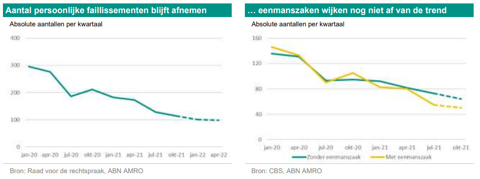 Het is daarom de vraag of de faillissementen van eenmanszaken gaan oplopen zodra de (overige) bedrijfsfaillissementen gaan oplopen, of gelijk blijft opgaan met de faillissementen van natuurlijke personen zonder eenmanszaak. In onze prognose voor bedrijfsfaillissementen gaan we ervan uit dat de bedrijfsfaillissementen dit kwartaal al oplopen, terwijl de faillissementen van natuurlijke personen zonder eenmanszaak pas na 2022 oplopen. (Piet Rietman)