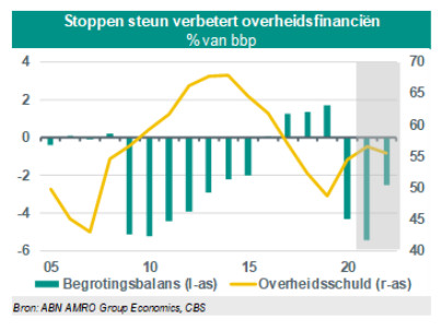 Omdat onze macro-economische opvattingen voor 2022 iets minder gunstig zijn dan die van het CPB verwachten wij ook een licht negatievere balans op de begroting. Waar het CPB uit gaat van -2,3% van het bbp gaan wij uit van een tekort van -2,5% van het bbp. De gevolgen voor de schuld zijn nagenoeg verwaarloosbaar. (Jan-Paul van de Kerke)
