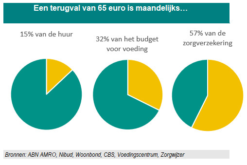 Voor veel bijstandsgerechtigden gaat de terugval van zo’n € 65,00 per maand af van de vaste lasten – zoals huur en zorgverzekering – of noodzakelijke uitgaven zoals voeding. Voor voeding geldt dat volgens het Voedingscentrum zo’n nodig is om gezond te blijven, terwijl een gemiddelde bijstandsgerechtigde er volgens het Nibud (in 2020) € 214,00 aan uitgaf. € 65,00 op voeding bezuinigen en gezond blijven is dus niet te combineren.