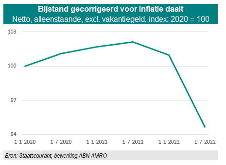 Over een week, op 1 juli 2022, gaat het maandbedrag voor de bijstand omhoog. Een alleenstaande bijstandsgerechtigde ontvangt dan, netto en exclusief vakantiegeld, € 1046,37 per maand. Dat bedrag is 2,1% hoger dan op 1 juli vorig jaar, terwijl volgens onze schatting de consumentenprijzen in dezelfde periode 8,4% stegen. Een alleenstaande bijstandsgerechtigde lijdt daarmee een statisch koopkrachtverlies van 6,3%.