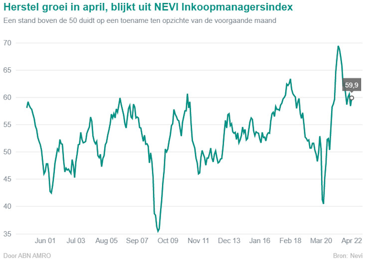 De NEVI Inkoopmanagersindex voor de Nederlandse industrie steeg van 58.4 in maart naar 59.9 in april, wat duidt op iets snellere groei. Verrassend genoeg namen zowel de productie als de nieuwe orders sneller toe, ondanks de oorlog in Oekraïne en het steeds grotere aantal Chinese steden in lockdown.