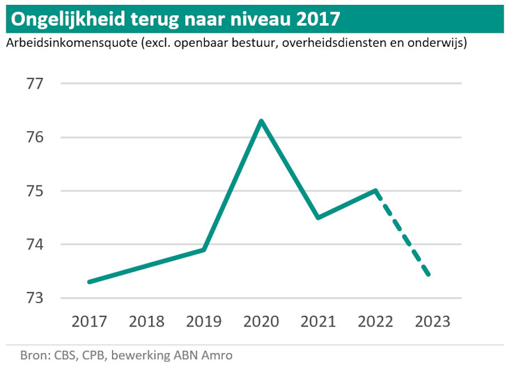 Het koopkrachtpakket kan ook niet voorkomen dat de ongelijkheid weer toeneemt. In de prognose van het CPB keert de arbeidsinkomensquote (AIQ) zelfs terug naar het niveau van 2017. De arbeidsinkomensquote is het gedeelte van het nationaal inkomen dat uit arbeid komt, zoals loon, versus inkomen uit kapitaal zoals winst, dividend en huur. Voor de AIQ waren ook de coronajaren de goede jaren. In 2020 steeg de AIQ flink omdat de winsten onder druk stonden terwijl de loongroei dankzij de NOW-regeling redelijk op peil bleef.