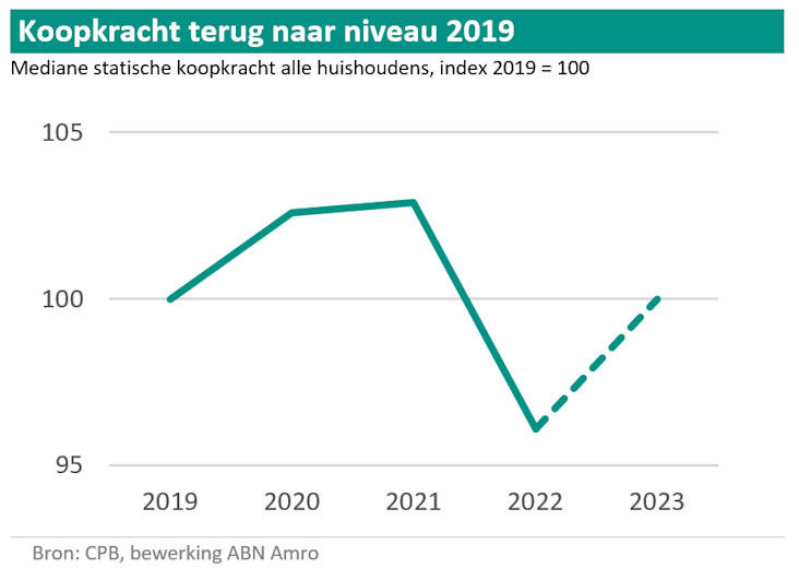 gaat het CPB er vanuit dat de mediane koopkracht met 3,9% stijgt in 2023. De mediane koopkracht daalde in 2022 echter met 6,8%. Al met al is na de koopkrachtimpuls van 2023 de koopkracht volgens het CPB nog altijd op het niveau van 2019. De koopkracht is dus niet hersteld maar teruggekeerd naar het niveau van vier jaar geleden: