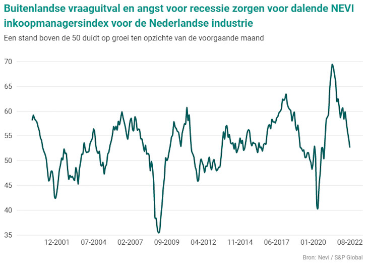 De NEVI Inkoopmanagersindex voor de Nederlandse industrie blijft dalen. Was de stand van 54,5 in juli al de laagste score in twintig maanden, in augustus daalde de index naar 52,6.