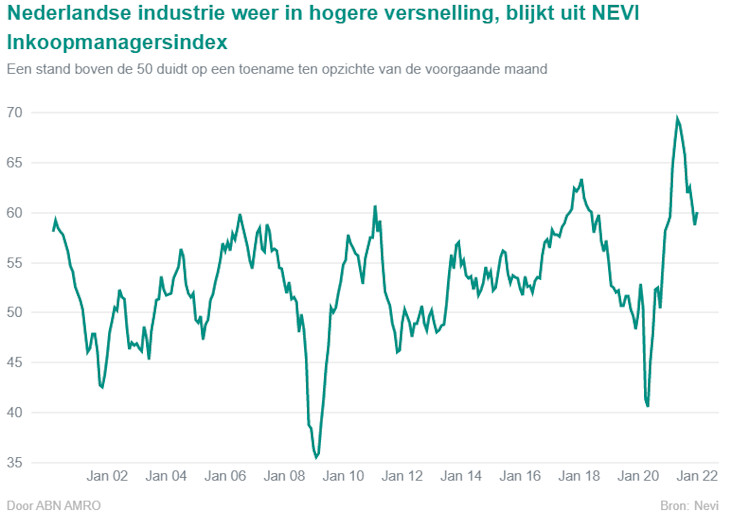 De NEVI Inkoopmanagersindex voor de Nederlandse industrie steeg van 58,6 in december naar 60,1 in januari. Het lijkt erop dat dat de ontregeling van toeleveringsketens wat afneemt, wat leidt tot een hogere productie en daarmee meer werkgelegenheid.