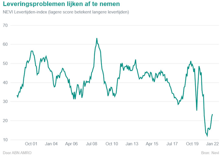 Daarmee wordt tevens duidelijk dat de toeleveringsketens niet verder ontregeld lijken te worden door de snelle opkomst van de Omikron-variant en de maatregelen daartegen. In januari gaf weliswaar 55 procent van de Nederlandse industriële ondernemers aan dat de levertijden toenemen, maar dit is veel lager dan het record van 76 procent in juni. Het lijkt erop dat het tekort aan materialen afneemt en dat er langzaam een nieuw evenwicht ontstaat tussen vraag en aanbod. Wel is vermoedelijk personeelstekort nog een rem op de groei van de productie. Omikron kan dat personeelstekort de komende maanden verergeren, door hoger ziekteverzuim en quarantaine.