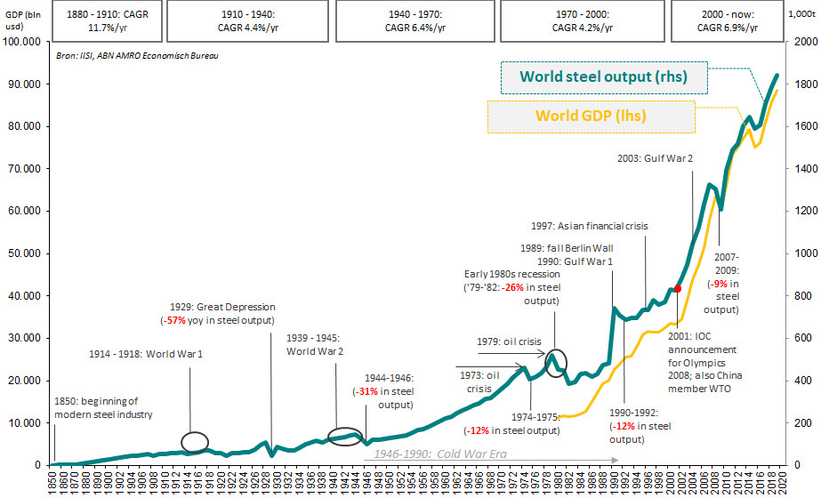De groei van de Chinese staalsector is ongekend. Met name vanaf 2001 is het hard gegaan, met twee ijkpunten in dat jaar. Zo honoreerde het Olympisch Comité op 13 juli 2001 dat de zomerspelen van 2008 in Beijing zouden plaatsvinden. Voor China was dit aanleiding om flink te investeren in stadions en infrastructuur om de wereld te laten zien dat het een moderne economie heeft. De vraag naar staal nam in de jaren daarna een vlucht.