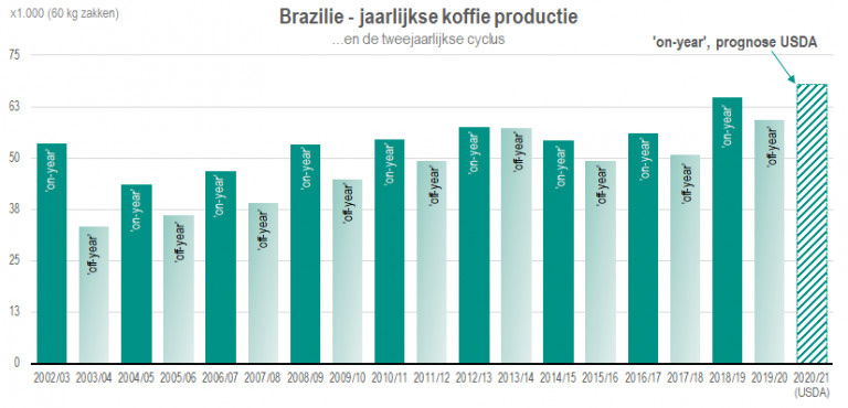 Volgend seizoen wordt dus een on-seizoen met een grotere koffieoogst. Dit blijkt ook uit de prognoses. In haar laatste rapport over de koffiemarkt (juni 2020) ging het Amerikaanse ministerie van landbouw (USDA) er nog van uit dat de mondiale productie van koffie toe zou nemen met 5,5%. Daarmee zou weer een nieuw record gevestigd worden van 176,1 miljoen zakken (van 60 kilogram).