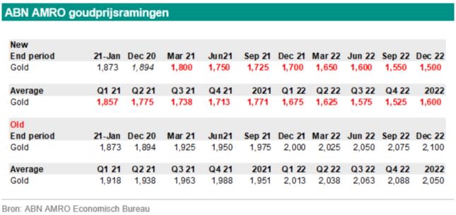 De vooruitzichten voor de goudprijs zijn aanzienlijk verslechterd. We denken zelfs dat de stijging voorbij is. Hiervoor zijn verschillende redenen aan te voeren. Ten eerste hebben we onze visie ten aanzien van het beleid van de Fed aangepast. We verwachten dat het opkoopprogramma met de huidige snelheid doorgaat tot tenminste eind 2021. Voor 2022 verwachten we dat de Fed gaat taperen, oftewel dat de hoeveelheid aankopen afneemt. We houden er rekening mee dat de eerste renteverhoging in 2023 volgt. We denken dat de Fed uiterst langzaam de rente zal verhogen. Het is niettemin veel eerder dan in ons vorige scenario. Een minder verruimingsgezinde Fed is negatief voor de goudprijs.