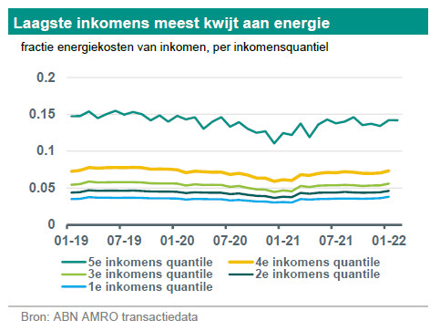 Afgelopen vrijdag meldde het CBS dat de Europees geharmoniseerde consumentenprijsindex (HICP) is gestegen in maart naar 11,9%. De jaar-op-jaar percentuele stijging van energie (excl. motorbrandstoffen) was 103%. Uit ABN Amro transactiedata van maart blijkt dat Nederlandse huishoudens gemiddeld iets meer uitgaven aan hun energierekeningen dan in de maand ervoor. De jaar-op-jaar stijging van energiekosten van huishoudens ligt daarmee op ongeveer 20% (lees waarom deze percentages zo veel verschillen). In onze data vinden we geen bewijs dat lage inkomens momenteel met een hoger percentuele stijging te maken krijgt dan hogere inkomens, alle inkomens groepen ervaren een stijging van de rond 20%.