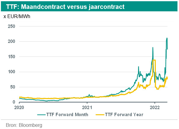 Na de invasie van delen van Oekraïne door Rusland zijn de markten het risico van aanbodtekorten blijven incalculeren. Het actieve maandcontract van de Title Transfer Facility (TTF) bereikte de grens van 200 EUR/MWh alvorens enigszins te dalen. Hoewel de Russische export tot dusver is blijven doorgaan en zelfs een beetje is toegenomen, neemt het risico dat de gasmarkten worden getroffen door sancties of zelf-sanctionering met de dag toe. Onlangs heeft de Russische minister van Energie aangegeven dat hij een verbod zou kunnen overwegen op de uitvoer van Russisch gas via Nord Stream 1, een pijpleiding die van Rusland rechtstreeks naar Duitsland loopt. Een dergelijke maatregel zal de EU op zeer korte termijn misschien niet schaden, maar zou wel onmiddellijk ernstige risico's inhouden voor het aanleggen van gasvoorraden voor de volgende winter. Wat Russisch LNG betreft, hebben de verschepingen naar Europa het al moeilijk. Nadat het VK een verbod op Russische zeeschepen heeft ingesteld, is de aanvoer van Russisch LNG moeilijker geworden. Naast het maandcontract zit daarom ook het jaarcontract in de lift en wordt het verhandeld boven EUR 80/MWh, zoals blijkt uit onderstaande figuur.