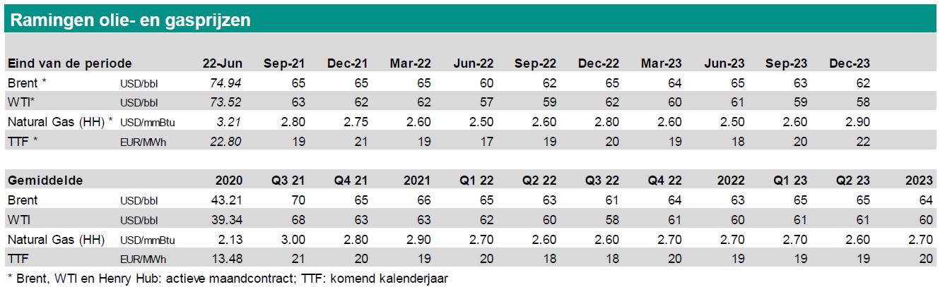 Wij verwachten dat de olieprijs niet veel verder zal stijgen. De prijs ligt al ruim boven het officieuze gestelde doel van OPEC+ (rond de USD 60/vat). Grote consumenten zullen zich gaan roeren en uiteindelijk zal deze hoge olieprijs ook leiden tot meer productie in de VS. Tot slot zal er mogelijk meer aanbod komen uit Iran en zal OPEC+ zich genoodzaakt voelen de olieproductie verder te laten toenemen om de marktbalans te behouden. Tegelijkertijd zal het neerwaarts prijspotentieel ook kleiner worden. Tenzij er een nieuw coronavirus opduikt dat nieuwe lockdowns veroorzaakt en de vraag naar olie negatief beïnvloed, verwachten wij dat de vraag/aanbod balans redelijk intact blijft. Een olieprijs dat schommelt tussen USD 60-70/vat zou hier het beste bij passen. Aangezien dit boven onze huidige ramingen ligt, stellen wij onze olieprijsramingen iets naar boven bij. Onze jaareinderaming voor Brent is verhoogd van USD 60/vat naar USD 65/vat. Hierdoor komt het 2021 jaargemiddelde uit op USD 66/vat (ten opzichte van USD 62 eerder). Zie voor al onze prijsverwachtingen de tabel op de volgende pagina.