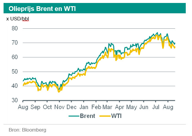 In het maandelijkse Oil Market Report van het Internationaal Energieagentschap (IEA) wordt verwacht dat de mondiale vraag naar olie zal doorstijgen tot gemiddeld 96,2 miljoen vaten per dag (mv/d) in 2021 en 99,4 mv/d in 2022. Eind 2022 zal de vraag naar olie dan naar verwachting liggen op 100,2 mv/d. De vraag naar olie is dan volledig hersteld en terug op het niveau van voor corona. Het IEA verwacht wel dat er in de loop van 2022 een overaanbod aan olie ontstaat. Dat is te wijten aan het neerwaarts bijstellen van de verwachtingen voor de vraag naar olie nu nieuwe corona-varianten het herstel van de vraag lijken te dempen. Een maand geleden vroeg het IEA nog aan OPEC+ om de productie sneller te verhogen om aan de vraag te voldoen. Deze oproep werd overigens onlangs herhaald door president Biden. De benzineprijzen in de VS zijn in een jaar tijd met ruim 40% gestegen, waardoor een gallon benzine gemiddeld in de VS nu USD 3,50 kost (ten opzichte van USD 2,50 een jaar geleden).