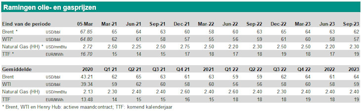 Wij schatten het risico hoog in dat op een gegeven ogenblik de OPEC+ de olieproductie alsnog verder versneld zal opvoeren op het moment dat a) de olieprijs – met name WTI – structureel boven de USD 50/vat blijft (zoals nu het geval is voor alle futures prijzen in de forward curve), en b) als gevolg van de hoge olieprijs de olieproductie in de VS sneller gaat herstellen. Een belangrijke reden waarom de Amerikaanse olieproductie de afgelopen maand niet is versneld, was het extreme winterweer in het gebied rond de Golf van Mexico. Dit naast de bekende redenen waarom een herstel van de olieproductie in de VS toch al langer zou duren. Dit zijn het lastiger toegang hebben tot financiering en de maatregelen die president Joe Biden heeft aangekondigd: strengere regelgeving en minder licenties voor het boren op federaal land. Hoewel Prins Abdulaziz bin Salman Al-Saud in de persconferentie aangaf geen problemen te hebben met schalieolie in het algemeen, weten we dat met name Rusland gebrand zal zijn op het handhaven van marktaandeel ten opzichte van de Amerikanen.