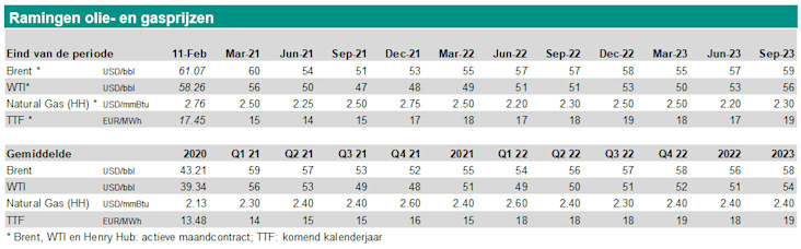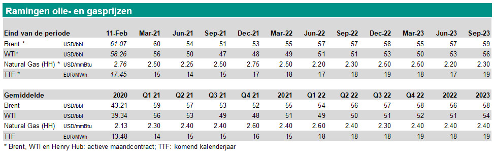 Marktoptimisme zorgt voor een stijgende olieprijs; technisch ligt de weg open naar USD 70/vat. OPEC+ zal druk voelen om de olieproductie sneller te verhogen. ABN AMRO stelt de olieprijsramingen bij naar boven; toch blijft de USD 50-60/vat bandbreedte het uitgangspunt.