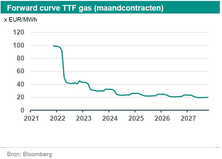 De forward curve (serie prijzen voor levering in de toekomst) laat zien dat de markt de grootste onzekerheid, en daarmee de grootste prijsdruk, voor de komende wintermaanden verwacht. De contracten met levering tot en met maart liggen ruim boven de EUR 90/MWh. Het contract voor levering in april 2022 ligt met EUR 50/MWh al een stuk lager. De rest van de contracten met levering in 2022 liggen tussen de EUR 40 en 45/MWh. De marktverwachting is dus dat na de wintermaanden de balans kan worden opgemaakt qua voorraadniveaus. Verder is het stookseizoen dan achter de rug en kan er opnieuw begonnen worden met het aanvullen van de voorraden voor de winter van 2022/23.