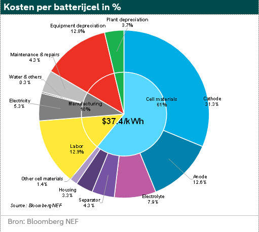 De bovenstaande grafiek toont de kostenverdeling van een batterijcel. De materialen die worden gebruikt om de cel te maken, maken 61% van de totale kosten uit. Een batterijcel is de basiseenheid van een batterij. Een batterijpakket bestaat uit vele batterijcellen die met elkaar zijn gecombineerd. Volgens BNEF vertegenwoordigt de batterijcel ongeveer 55% van de totale kosten van een volledig batterijpakket. De overige kosten omvatten het thermisch beheersysteem (9%), het batterijbeheersysteem (13%), de structurele onderdelen van het pakket (15%) en arbeid (6%), water, onderhoud en afschrijving (1%).