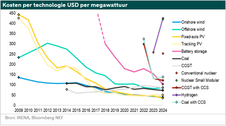 In de afgelopen tien jaar zijn de kosten van technologieën voor hernieuwbare energie sterk gedaald (zie onderstaande grafiek). Uit gegevens van IRENA en Bloomberg New Energy Finance (BNEF) blijkt dat windenergie op het land en zonne-energie goedkoper zijn geworden dan elektriciteit opgewekt uit gas en steenkool.