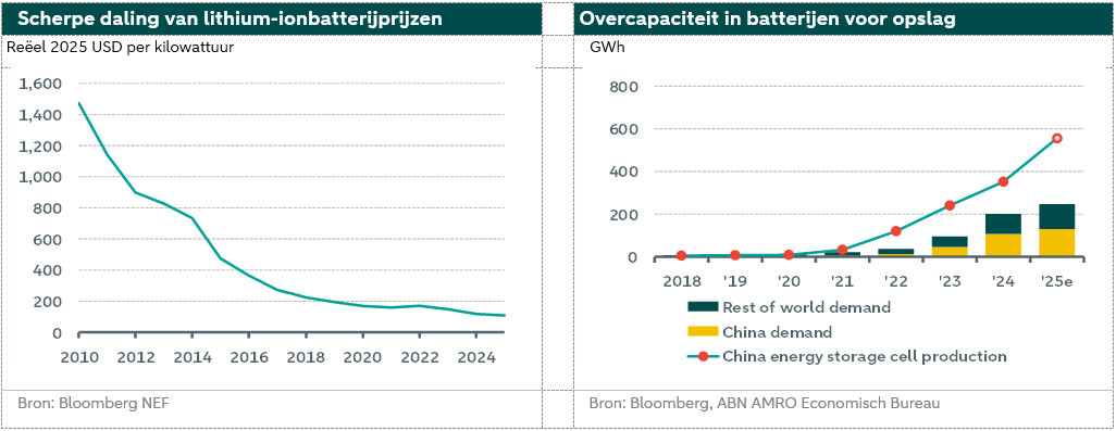 Sinds 2010 is de prijs van lithium-ionbatterijen sterk gedaald, van ongeveer USD 1.474 per kilowattuur tot USD 108 in 2025 (zie grafiek linksonder). Deze prijzen hebben betrekking op alle soorten lithium-ionbatterijen, niet alleen op LFP. Dit komt neer op een daling van 93%. Deze prijsdaling wordt slechts gedeeltelijk bepaald door de materiaalkosten. Een andere belangrijke reden voor de prijsdaling is het overaanbod. De vraag naar batterijen nam toe en fabrieken schaalden hun productie op. Naarmate fabrikanten meer batterijen produceerden, daalden de kosten per eenheid als gevolg van schaalvoordelen. Sinds enkele jaren is er sprake van een overaanbod op de batterijmarkt, ook voor opslag, waardoor de prijzen onder druk zijn komen te staan. De grafiek rechts laat zien dat de vraag naar batterijen in China en wereldwijd nog steeds ruim onder de totale productiecapaciteit ligt.