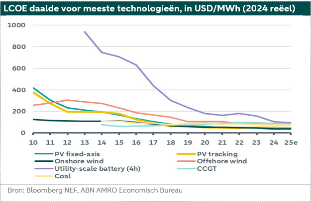 De kosten voor windenergie op land en zonne-energie zijn de afgelopen tien jaar aanzienlijk gedaald, terwijl die van koolstofafvang (CCS), energie-opslag en waterstof relatief duur zijn gebleven. Netcongestie, productiebeperking en lage prices voor producenten vormen steeds grotere obstakels voor het volledig benutten van hernieuwbare energie. Batterijen helpen om netcongestie te verminderen, om schommelingen in zon- en windproductie op te vangen, om energie op te slaan, en om de stabiliteit en economische haalbaarheid van projecten te verbeteren. Door een overaanbod zijn lithium-ion-batterijprijzen sterk gedaald. Echter zodra de vraag naar batterijen toeneemt en grondstofprijzen stijgen, is het mogelijk dat prijzen weer gaan stijgen. De focus gaat steeds meer van capaciteitsuitbreiding naar systeemintegratie. Dit heeft meer investeringen in opslag, netwerken en flexibele infrastructuur tot gevolg om daarmee een veerkrachtig energiesysteem te realiseren.
