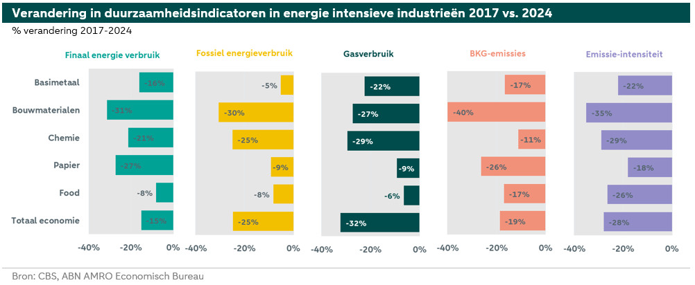 Uit bovenstaande overzicht blijkt dat bedrijven in deze sectoren duidelijk stappen hebben gezet op het gebied van decarbonisatie. In alle sectoren heeft de verandering in de indicatoren over de periode 2017-2024 een positieve uitwerking op de klimaatdoelen. De bouwmaterialenindustrie laat over de gehele breedte de beste resultaten zien, met de sterkste afnames van alle energie-intensieve industriële sectoren in de periode 2017-2024 in finaal en in fossiel energieverbruik, in BKG-emissies en emissie-intensiteit. Ook ten opzichte van de totale economie. De chemische industrie laat eveneens goede resultaten zien. Het valt hier echter op dat de BKG-emissies minder snel afnemen dan de overige indicatoren. Dit heeft ermee te maken dat deze industrie een groter pallet aan broeikasgassen uitstoot dan de andere sectoren. Een reductie in fossiel energie- en gasverbruik heeft vooral betrekking op de uitstoot van CO2. De voedingsmiddelenindustrie heeft meer moeite met het reduceren van energie- en gasverbruik. Dit komt doordat deze sector veel afhankelijker is van gas in het productieproces dan andere sectoren. Omdat goede alternatieven nog niet direct op grote schaal voorhanden zijn, maakt dit de transitie in deze sector complexer. De basismetaalindustrie – met name staalproductie – heeft een vergelijkbaar probleem, doordat deze sector nog erg afhankelijk is van het verbruik van cokeskolen voor het maken van staal.