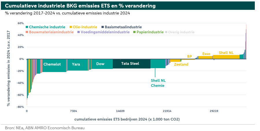 De verticale as laat vervolgens zien met hoeveel procent de CO2-uitstoot in de periode 2017-2024 (de post-Parijsakkoordperiode) is veranderd. Bij de bedrijven uiterst rechts in de figuur boven de horizontale as is de uitstoot toegenomen en bij de bedrijven links in de figuur onder de horizontale as is de uitstoot gedaald. Op deze manier ontstaat een EU ETS decarbonisatiecurve voor de Nederlandse industrie. De grote chemische bedrijven (waaronder Chemelot, Yara, Dow en Shell NL Chemie) en een aantal kleinere installaties hebben hun BKG-emissies verminderd, terwijl aan de rechterzijde van de figuur nog een flink aantal chemische bedrijven staat dat daar niet in is geslaagd. Alle 40 bedrijven waarvan de BKG-uitstoot is toegenomen in de periode 2017-2024 hebben samen een aandeel van 23% in deze industriële ETS-uitstoot. De overige 137 bedrijven zijn meer succesvol gebleken met hun klimaatmaatregelen.
