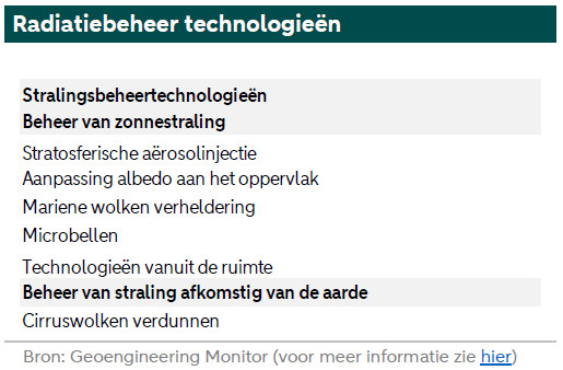 Geo-engineering verwijst naar een reeks opkomende technologieën die het milieu kan manipuleren en een deel van de klimaatverandering kunnen compenseren. Geo-engineering is een term die veel technologieën omvat die over het algemeen in drie categorieën vallen: koolstofvastleggingstechnologieën, beheer van zonnestraling en beheer van aardstraling. In dit rapport richten we ons op stralingsbeheer, inclusief technologieën voor het beheer van zonnestraling en aardstraling. Deze technologieën proberen het verband tussen emissies en concentraties te verbreken (zie voor meer informatie). De tabel hieronder geeft een overzicht van de geo-engineering stralingsbeheer-technologieën per categorie.