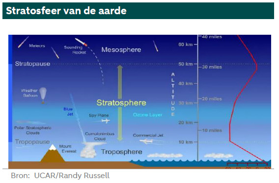 Voordat we deze technologie uitleggen, leggen we eerst de stratosfeer uit. De stratosfeer is de tweede laag van de atmosfeer als je omhooggaat. Ongeveer 10% van de atmosferische massa bevindt zich in de stratosfeer. Maar de lucht in deze laag is nog zo ijl dat je er in een oogwenk zou bevriezen. De stratosfeer is zeer droge lucht, die weinig waterdamp bevat. Hierdoor zijn er weinig wolken in deze laag. Door het gebrek aan verticale convectie in de stratosfeer kunnen materialen die in de stratosfeer terechtkomen daar lange tijd blijven. Grote vulkaanuitbarstingen en grote meteorietinslagen kunnen aerosoldeeltjes de stratosfeer in slingeren, waar ze maanden of jaren kunnen blijven hangen en soms het mondiale klimaat op aarde kunnen veranderen (zie voor meer informatie). De stratosfeer is gevuld met ozon (O3) en dit absorbeert schadelijke ultraviolette straling van de zon. De geabsorbeerde ultraviolette straling van ozon zorgt ervoor dat de temperatuur in de stratosfeer stijgt.