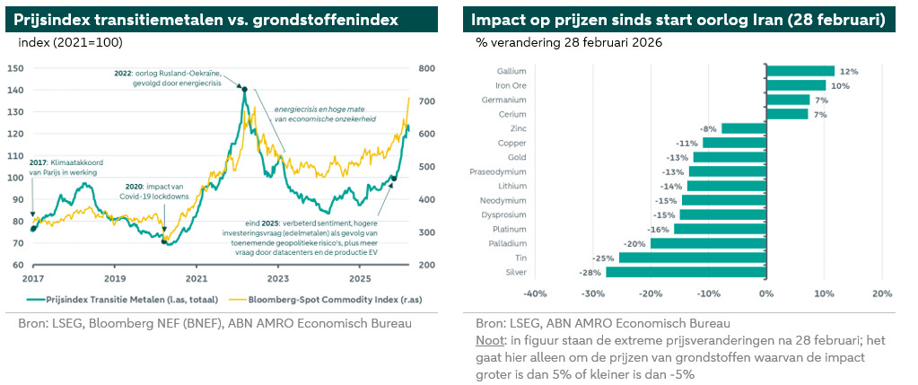 Toenemende geopolitieke onzekerheid is vaak een aanjager voor meer prijsvolatiliteit in grondstofmarkten. Voorbeelden hiervan zijn de schokken in de wereldhandel (met de VS als initiator met haar aanpassingen handelstarieven), de unieke monopolistische positie die China inneemt in veel grondstofmarkten (wat veel macht geeft) en mondiale militaire conflicten en spanningen (Venezuela, Groenland, China-Taiwan, Oekraïne en daar is de oorlog tussen Iran en Israël-VS bijgekomen). Dergelijke geopolitieke schokken legt de kwetsbaarheid van de mondiale toeleveringsketens bloot. Dit is bovenal het geval in het Iran-conflict, waarbij de afsluiting van de Straat van Hormuz de groei van de wereldhandel flink heeft verstoord. In onderstaande linker figuur hebben we de prijsindex van transitiegrondstoffen en de algemene grondstoffenindex van Bloomberg geplot, waarin de impact van bijvoorbeeld de oorlog in Oekraïne duidelijk zichtbaar zijn. En zo heeft ook het Iran-conflict haar impact. Met de start van de oorlog in Iran is de Bloomberg Commodity Index gestegen met 10% (door de stijging van de olie- en gasprijzen) en is de prijsindex voor transitiemetalen met gemiddeld zo’n 3% gedaald.