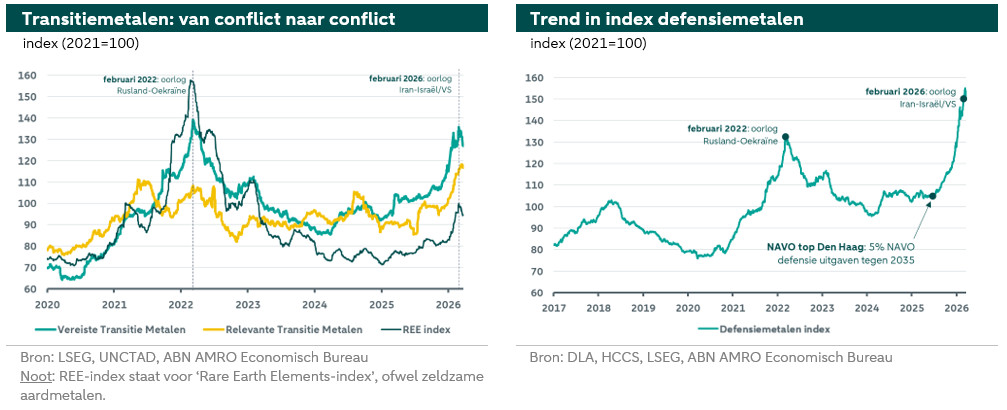 De impact van het Iran-conflict is groot op grondstofmarkten. Met het uitbreken van de oorlog en de aanval van Iran op olie- en gasinstallaties van buurlanden schoten de prijzen van energiegrondstoffen omhoog. Een dergelijke scherpe prijsreactie in andere grondstofmarkten (met name metalen) bleef aanvankelijk uit, omdat de impact van het Midden-Oosten op veel niet-fossiele grondstoffen nog niet direct tot veel paniek leidde. Inmiddels zijn we bijna vier weken verder en beginnen veel niet-fossiele grondstoffen steeds meer kleur te bekennen. In deze analyse gaan we dieper in op de trend in de index van transitiegrondstoffen en welke specifieke transitiemetalen sinds de start van de oorlog het meeste zijn geraakt. Ook laten we de prijsindex voor defensiemetalen zien en hoe deze verschilt van de trend in de prijs van transitiemetalen. Met deze analyse geven we inzicht in de verschillende prijstrends en geven we aan hoe dit impact kan hebben op het bedrijfsleven.