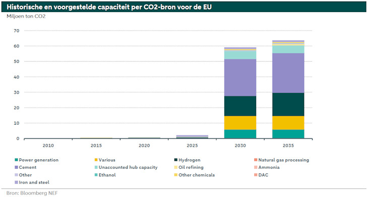 De onderstaande grafiek toont de historische en voorgestelde capaciteit per CO₂-bron voor de EU. Hieruit blijkt dat er in 2025 slechts een beperkt aantal projecten voor koolstofafvang zijn. Tegen 2030 zou koolstofafvang meer kunnen worden toegepast in de cement- en waterstofindustrie en bij de opwekking van elektriciteit. Maar de kosten voor deze technologieën moeten dalen of de ETS-prijs moet stijgen.