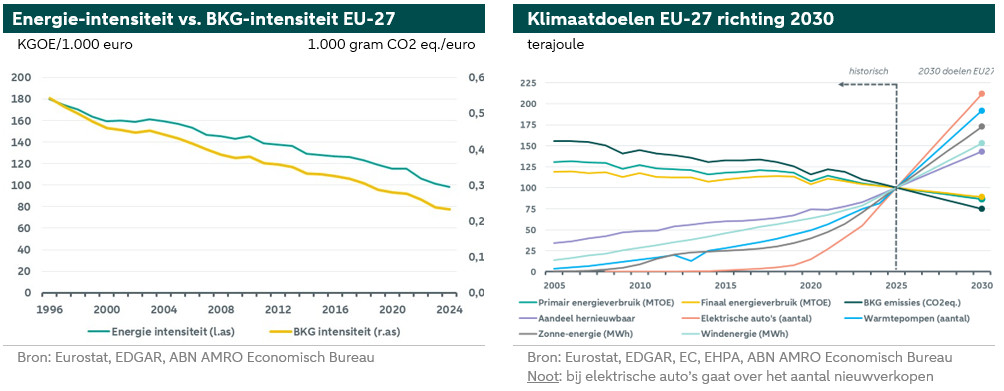 De emissie-intensiteit binnen de EU-27 daalt al jaren, mede door verbeteringen in energie-efficiëntie en de productiviteit, maar ook door een geleidelijke afname van fossiel energieverbruik. In de periode 2017-2023 is de energie-efficiëntie in de EU verbeterd. Investeringen in energie-efficiëntie spelen hebben hierbij een sleutelrol gespeeld, maar door oplopende productiekosten en arbeidstekorten is een noodzakelijke versnelling uitgebleven. Daarnaast heeft het EU-klimaatbeleid bijgedragen aan het opschonen van de energiemix en het verminderen van de emissie-intensiteit. De EU streeft naar ambitieuze klimaatdoelen tegen 2030, waaronder een klimaatneutrale economie in 2050 en relatief lage energieprijzen. Het bedrijfsleven blijft een cruciale factor in de transitie, met investeringen in koolstofarme technologieën en een focus op innovatie. Hierin kan stimulerend overheidsbeleid aan de hand van financiële prikkels helpen om een versnelling in de verduurzaming op gang te krijgen (zie hier). Naar verwachting zullen energie- en emissie-intensiteit verder blijven dalen, mits de EU de teugels van het klimaatbeleid niet teveel laat vieren.