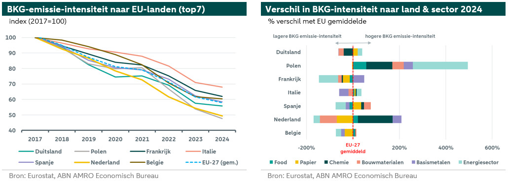Het vergelijken van de emissie-intensiteit tussen de afzonderlijke EU-landen en de trends daarin, brengt de grote verschillen tussen die landen aan het licht. De bovenstaande rechter figuur laat zien dat de emissie-intensiteit per EU-land sterk varieert. Zo heeft Frankrijk een relatief lage emissie-intensiteit, doordat het land voor een groot deel afhankelijk is van nucleaire energie in haar energievoorziening. Luxemburg heeft ook een relatief lage emissie-intensiteit. Dit komt doordat het land een laag aandeel van de industrie heeft in haar economie. Dit is namelijk slechts 4% van bbp in 2024 (het EU-27 ligt op een gemiddeld aandeel van 16% van het bbp voor de industrie). En in Zweden is het verbruik van olie – de voornaamste fossiele brandstof in het land – tussen 2017 en 2023 met 19% gedaald, terwijl hernieuwbare energie met 14% is toegenomen in dezelfde periode. Daarmee is het land het minst emissie-intensief van alle EU-landen. Bulgarije en Polen hebben op hun beurt echter een veel hogere emissie-intensiteit – en voeren de ranglijst van de EU-27 aan – omdat deze landen sterk afhankelijk zijn van fossiele brandstoffen in hun energievoorziening, maar ook omdat ze een hoog aandeel energie-intensieve industrie in hun economie hebben.