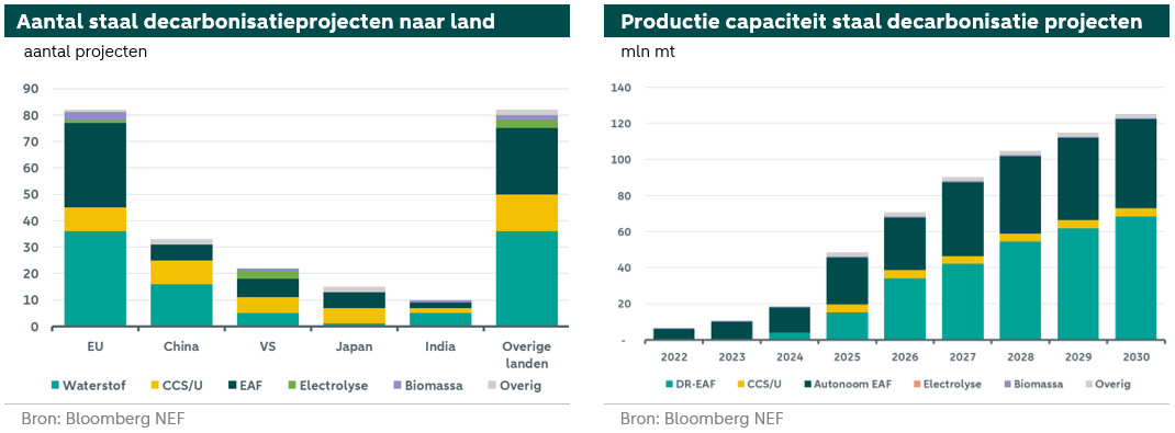 Ondanks de relatief zwakke marktomstandigheden lopen er momenteel mondiaal verschillende decarbonisatieprojecten in de staalindustrie. Volgens data van Bloomberg New Energy Finance (BNEF) vinden verreweg de meesten daarvan hun oorsprong in Europa, waarvan sommige inmiddels bevestigd zijn en andere nog in de pionierfase zitten. Veel van deze projecten hebben echter betrekking op een productieproces op basis van de EAF-route of aan de hand van waterstof voor het omzetten van ijzererts omzetten in ijzer. Met name van waterstof zijn de verwachtingen voor de komende jaren hoog.