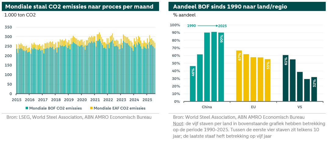 Per ton geproduceerd staal via de BOF-route komt volgens de World Steel Association 2,32 ton CO2 vrij. Via de EAF-route is dit 0,7 ton CO2. Als we uitgaan van deze verhouding dan kunnen we vervolgens een inschatting maken van de totale uitstoot van CO2 door de productie van staal. Dit geeft bovenstaande linker figuur weer.