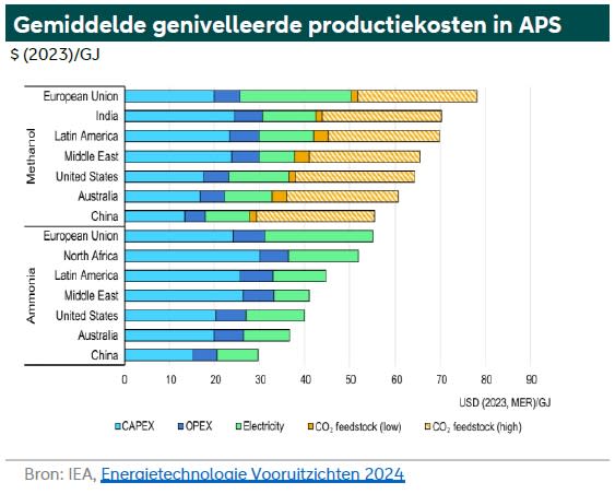 Tegen 2030 zal groene ammoniak echter naar verwachting in alle landen goedkoper zijn dan blauwe ammoniak
