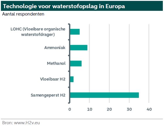 Onlangs schreven we ons rapport ESG & Economie over energieopslag (zie hier voor meer informatie). Eén van de soorten energieopslag is chemische opslag. Chemische energieopslag is energie die is opgeslagen in de vorm van chemische brandstoffen die gemakkelijk kunnen worden omgezet in mechanische, thermische of elektrische energie voor industriële en netwerktoepassingen (zie voor meer informatie). Voorbeelden van chemische brandstoffen zijn waterstof en ammoniak. Met waterstof kan de energie onbeperkt worden opgeslagen. Maar waterstof kent uitdagingen, zoals een lage round-trip efficiëntie van ongeveer 30-40%, veel lager dan die van andere opslagtechnologieën. Round-trip efficiëntie is de verhouding tussen de totale energie-output van het systeem en de totale energie-input van het systeem, zoals gemeten op het aansluitpunt. Waterstof kan fungeren als chemische energieopslag, maar het kan ook worden omgezet in methaan en ammoniak. Ammoniak is een andere potentiële energiedrager. Er is een bestaande infrastructuur vanwege het wijdverspreide gebruik als meststof, maar het heeft ernstige veiligheidsproblemen. De technische gereedheidsniveaus van chemische energieopslag variëren van 6 tot 9.