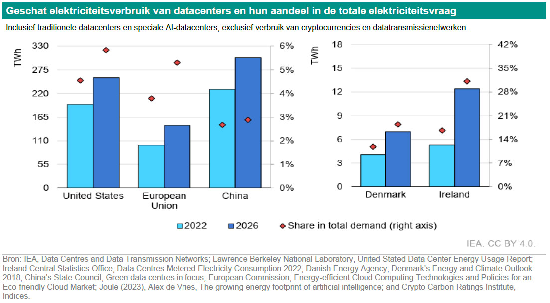Tot slot gebruikt de IT-infrastructuur, inclusief AI-systemen in data centers, veel energie (zie bovenstaande grafieken) en water. Hoe groter het Large Language Model (LLM), hoe meer energie er wordt gebruikt om het te trainen. Large Language Models hebben deep learning-algoritmen die een verscheidenheid aan natuurlijke taalverwerkingstaken kunnen uitvoeren. Een LLM met 110m parameters stootte 0,64 ton CO2 uit in de trainingsfase. Een andere LLM met 75b parameters had daarentegen een trainingsvoetafdruk van 550 ton. 60%-90% van de uitstoot wordt gegenereerd door inferencing, het uitvoeren van het model op live gegevens. Als reactie hierop creëren onderzoekers kleinere modellen en optimaliseren ze de afweging tussen trainingssnelheid en energieverbruik (zie voor meer informatie in Engels). In Singapore maakt men zich steeds meer zorgen over het toenemende energieverbruik en de steeds grotere koolstofvoetafdruk van de datacenterindustrie. Een typisch datacenter van 20 MW op het eiland verbruikt dezelfde hoeveelheid elektriciteit per dag als ongeveer 60.000 huishoudens (zie voor meer informatie). In regio's met hogere buitentemperaturen moeten de systemen meer worden gekoeld (via energie of water). Wereldwijd wordt de koolstofvoetafdruk van datacenters geschat op meer dan 2% van de wereldwijde koolstofuitstoot. Dit aantal zal naar verwachting stijgen tot 3,2 procent in 2025 en 14 procent in 2040 (zie ). Naast het grote energieverbruik gebruiken datacenters ook veel water voor koeling.