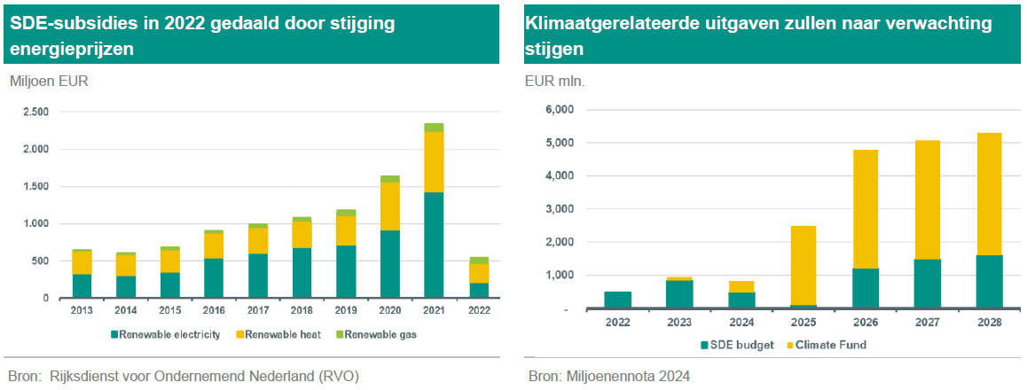 Vooruitkijkend is het moeilijk om precies in te schatten hoeveel van deze subsidies naar wind- en zonne-energie gaan. Niettemin wordt op basis van de begrotingsplannen van de regering tot 2028 een stijging van de uitgaven aan het Klimaatfonds verwacht, terwijl de SDE-subsidies naar verwachting slechts marginaal zullen stijgen (zie grafiek rechtsonder). Toch merken we opnieuw op dat een aanzienlijk deel van het Klimaatfonds naar verwachting zal worden besteed aan waterstof gerelateerde projecten.