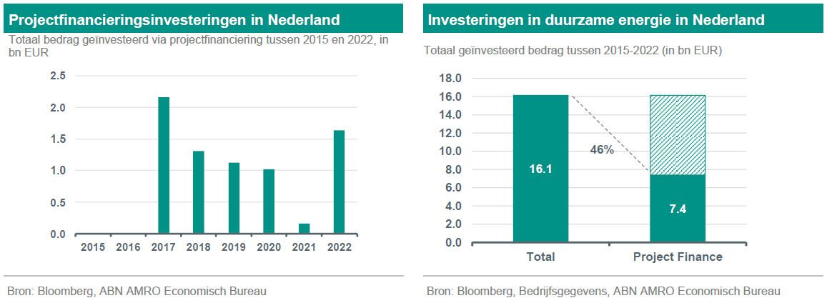 Om te beoordelen welk deel van de projectfinanciering in Nederland wordt gebruikt voor de financiering van hernieuwbare energieprojecten, hebben we gebruik gemaakt van gegevens van Bloomberg, waaruit blijkt dat tussen 2015 en 2022 in totaal 7,4 miljard euro aan projectfinancieringsleningen is verstrekt.