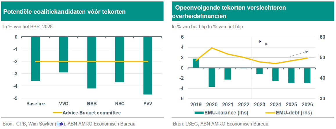 Daarnaast wordt verwacht dat de Nederlandse financiële situatie de komende jaren zal verslechteren. Op dit moment is de schuld/BBP-ratio van Nederland minder dan 50%, wat in vergelijking met andere landen als relatief gezond wordt beschouwd. De overheid heeft de afgelopen jaren echter te maken gehad met tekorten en op basis van de plannen van de politieke partijen die betrokken zijn bij de onderhandelingen, zullen deze tekorten de komende jaren hoogstwaarschijnlijk verder oplopen (zie onderstaande grafieken). Niet alleen zal dit negatieve gevolgen hebben voor zowel het tekort als de schuldquote, er bestaat ook het risico dat extra uitgaven leiden tot verdringing van andere uitgaven. Gezien de demografische piramide van Nederland wordt bijvoorbeeld verwacht dat de vergrijzende samenleving de komende decennia hogere kosten voor de gezondheidszorg met zich mee zal brengen. Bovendien zullen, gezien de huidige geopolitieke situatie, de defensie-uitgaven waarschijnlijk ook stijgen. Al deze extra kosten kunnen dus ten koste gaan van andere uitgaven en het valt nog te bezien of de nieuwe regering bereid is om voldoende geld uit te geven aan klimaat gerelateerde projecten om de klimaatdoelen te halen die de vorige regering heeft gesteld.